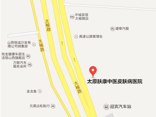 77路,55路, 813路,822路,877路,619路,838路,864路,11路,23路,901路,201路,902路公交车可达本院(长风街建设南路口/太榆路长风街口)下车,步行至太原肤康中医皮肤病医院。